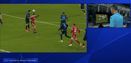 国米球员投诉范迪克手球,VAR介入,经过5分钟的等待,裁判亲自查看后,认定范迪克手球助攻,进球无效。